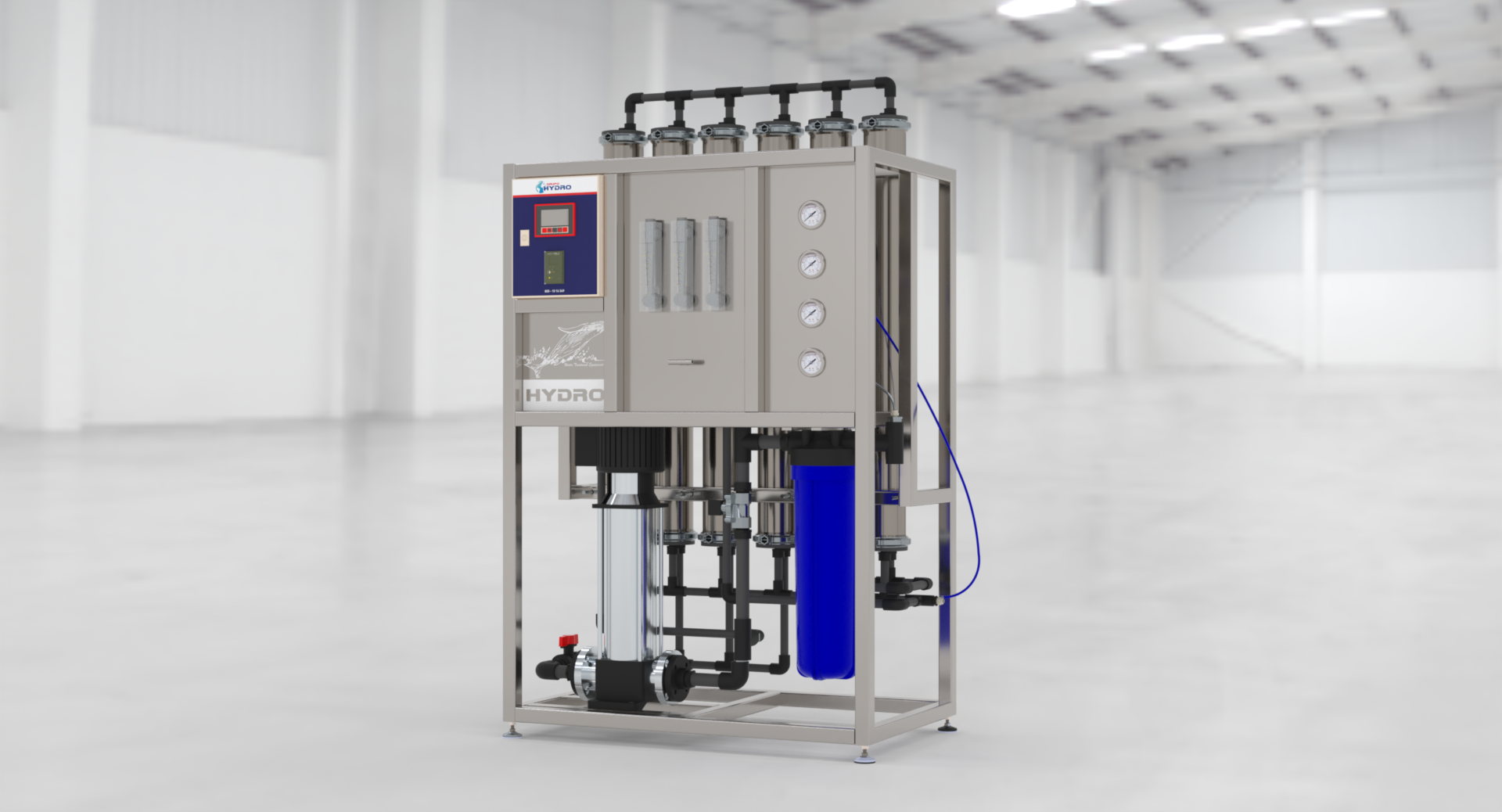 Sistema de ósmosis inversa con 6 membranas, opción a doble paso, monitoreo programable (HMI de 3”) y estructura abierta en acero al carbón o inoxidable.