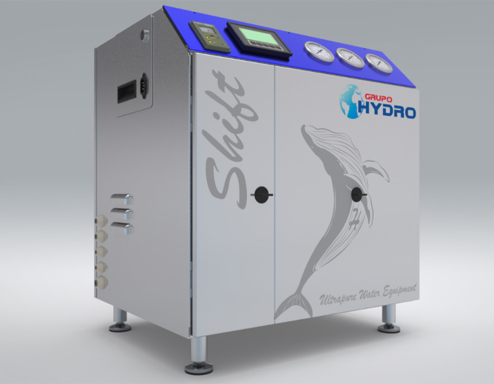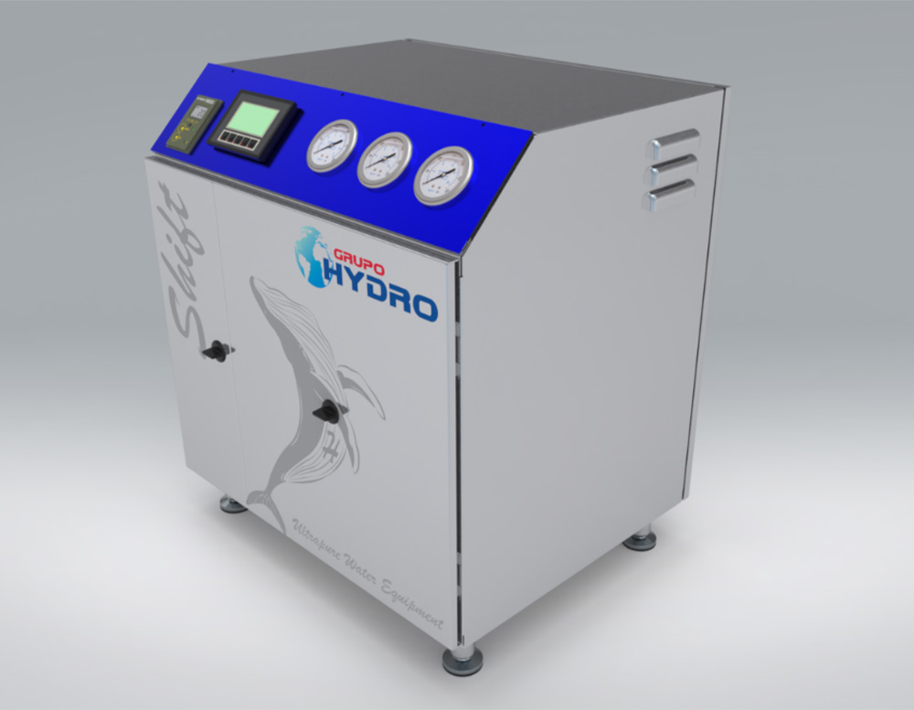 Equipo compacto y silencioso que integra protección interna, control PLC con HMI 3”, monitor de resistividad y tratamiento UV + microfiltración para pureza superior.