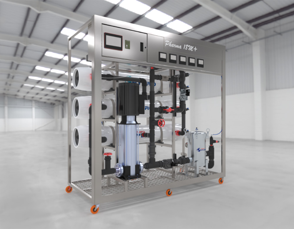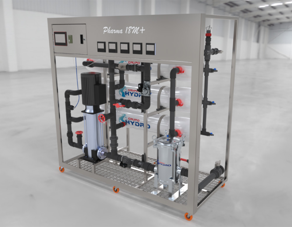 Sistema de ósmosis inversa de doble paso en acero inoxidable acabado espejo, con 3 membranas, PLC y monitoreo digital integral.